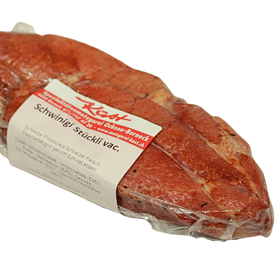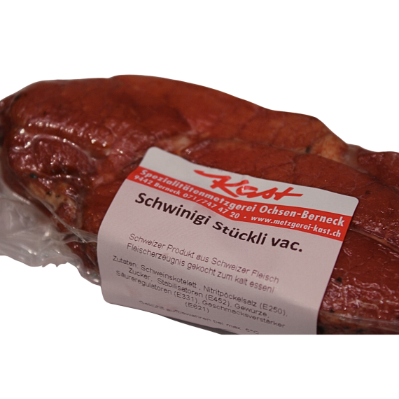 Zutaten: Schweinskotelett, Nitritpökelsalz (E250), Zucker, Stabilisatoren (E452), Gewürze, Säureregulatoren (E331), Geschmacksverstärker (E621)